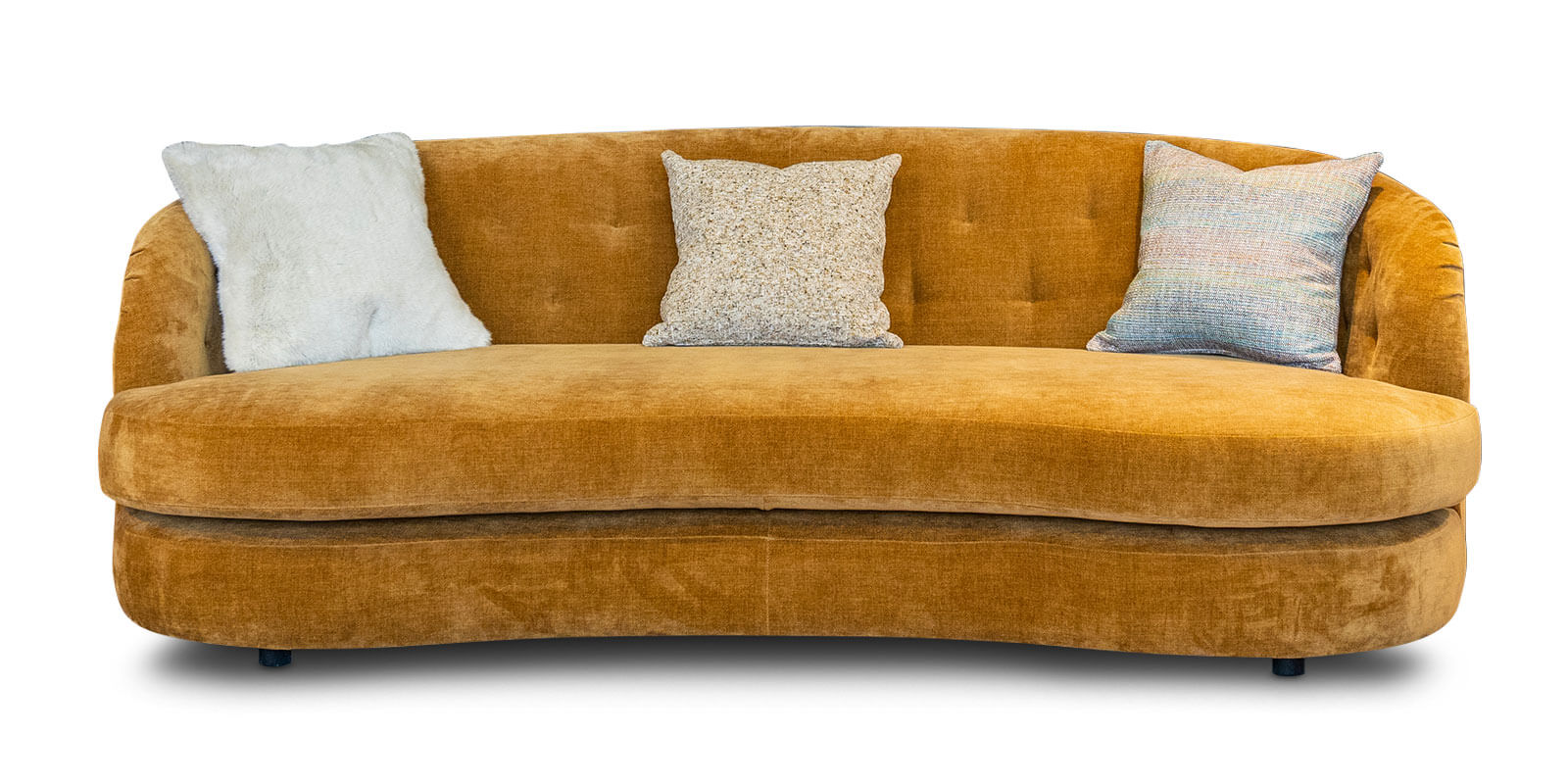 Its plush fixed back features subtle blind pulls, artfully emphasising the softness and inviting aesthetic. The graceful, swooping curves of the silhouette create a statement piece that is as visually captivating as it is comfortable.