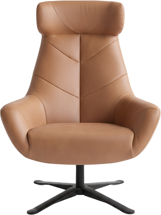 The distinctive sleek silhouette of the Leaf/Lyford swivel chair is perfectly proportioned with a tapered high-back design and low open arms that curve for comfort.